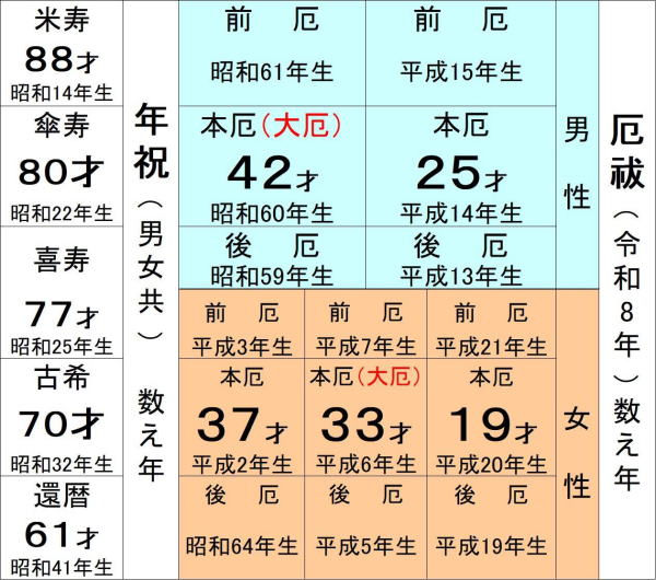 人生、山あり谷あり。古くから人々は豊富な経験に基づいて、特に気をつけなければならない年回りを「厄歳」と呼びました。一般には男性は数え年25歳、42歳。女性は19歳、33歳が「厄歳」にあたります。 中でも男性の42歳、女性の33歳は万事を慎むべき「大厄」とされます。この年齢は、人生の中での大きな節目でもあります。神前でお祓いを受け、神さまの御加護により、無事に過ごせるように祈りつつ、謙虚な気持ちで生活を送りましょう。